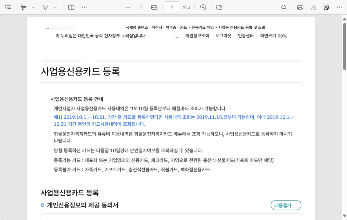▶ 국세청 홈택스 - 계산서ㆍ영수증ㆍ카드 > 신용카드 매입 > 사업용 신용카드 등록 및 조회