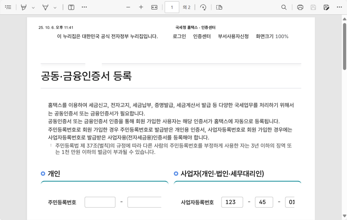 - 공동인증서 발급 → 홈택스 등록