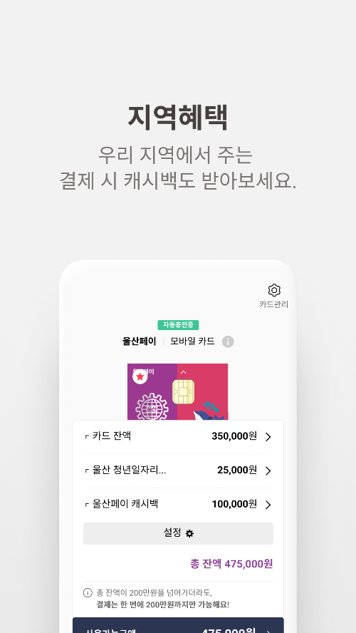 울산페이는 울산시에서 발행하는 지역화폐로 앱에서 충전한 후 카드 결제로 사용할 수 있는 방식입니다.